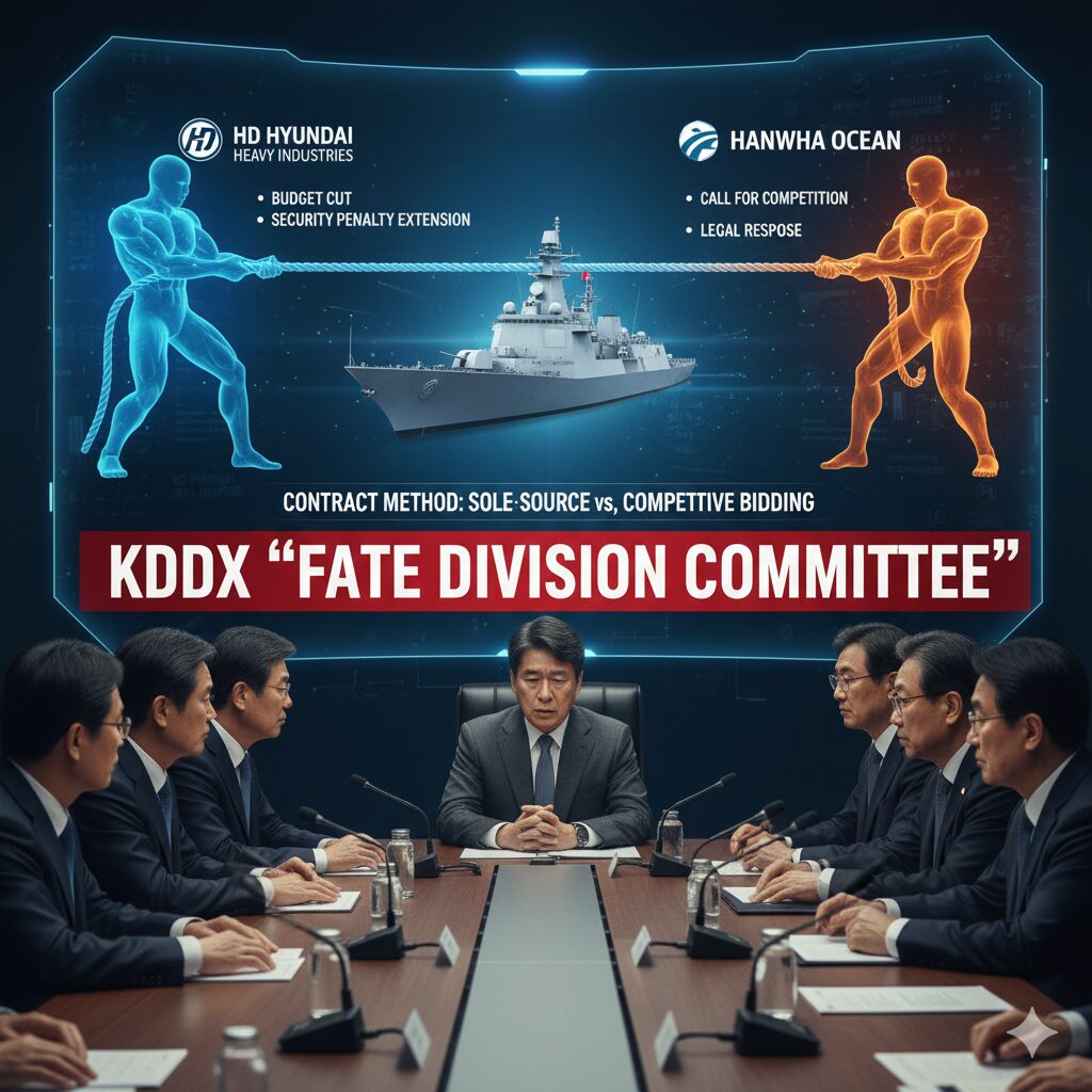 오늘(4일), 방위사업청이 KDDX(한국형 차기 구축함)의 ‘상세설계 및 선도함 건조’ 사업자 선정 방식을 결정하기 위한 사업분과위원회를 개최합니다. HD현대중공업과 한화오션의 갈등으로 장기간 표류해온 이 사업이 **수의계약(HD현대 유리)**으로 갈지, **경쟁입찰(한화오션 유리)**로 갈지 결정되는 중요한 날입니다.