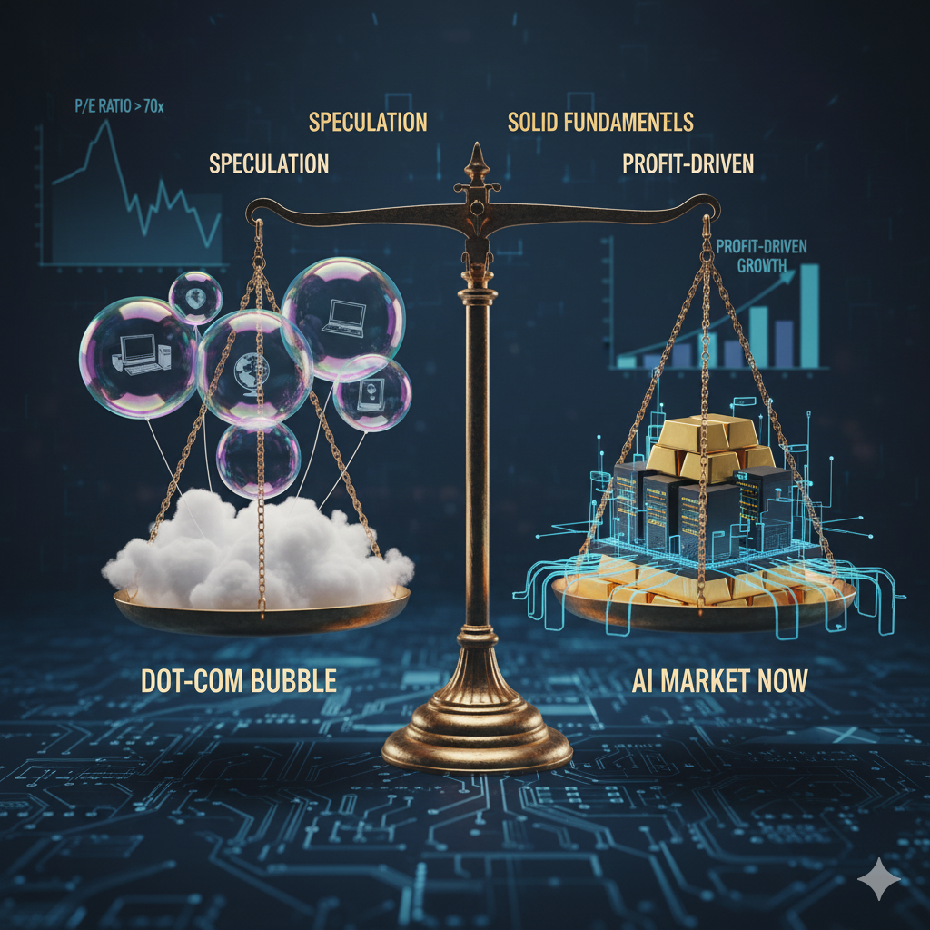I. AI ๋ฒ๋ธ๋ก vs. ๋ท์ปด ๋ฒ๋ธ(Dot-com Bubble): ์ ์ฌ์ ๊ณผ ๊ทผ๋ณธ์ ์ฐจ์ด์